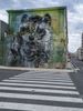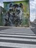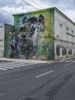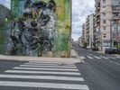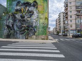 An intersection in Lisbon, Portugal, showcasing urban design and infrastructure. Buildings and open spaces create a vibrant cityscape. Graffiti walls add artistic flair to the residential neighborhood. The sky serves as a backdrop to the bustling city life.