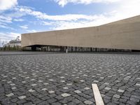 A modern architectural facade in Lisbon, Portugal. The black rectangle contrasts with the cobblestone road. The open space and clear sky enhance the beauty of the composite material used in this European city.