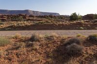 A rugged landscape in Utah's desert, featuring red rock formations and a clear sky. Lock Hart Road snakes through the terrain, surrounded by shrubs and vegetation. The brown, gravel surface contrasts with the highland's grassy plains.