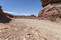 a dirt road in a desert area next to some rocks and boulders on a sunny day