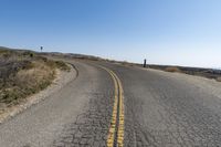 A scenic two-lane road in Lompoc, California, leading uphill towards the mountains. The clear blue sky and coastal landscape create a picturesque view. The road curves along the coast, offering a straight-down-the-road perspective.