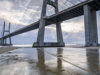 A symmetrical bridge in Lisbon, Portugal, spans over the ocean, providing a stunning view of the coastal city. The bridge's composite material contrasts with the clear blue sky and the wet road surface below. A perfect day to explore Lisbon's open spaces.