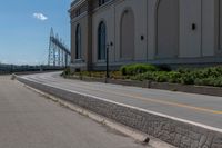 A lone bird perched on the curb next to an asphalt road, with a bridge in the background. Clouds fill the sky on this sunny day in Canada, near Niagara Falls. A scene outside a museum in Toronto.