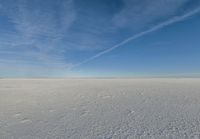 This stock photo features a peaceful and serene scene at Salt Lake, Utah, USA. In the early morning light of dawn, a solitary individual is seen walking in an open space on top of snow-covered ground. The person appears to be enjoying the breathtaking desert landscape and the wide expanse of nature surrounding them. The clear blue sky above showcases the beauty of the day, while contrails from passing aircraft add a touch of contrast to the scene. This packshot captures the tranquility and vastness of the salt lake area, presenting a perfect representation of the captivating nature of Utah.
