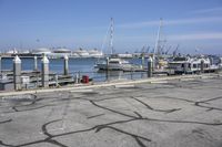 A line of boats docked along a concrete walkway in Long Beach, California. The coastal road offers stunning views of the ocean and clear skies. The black markings on the pavement add a touch of uniqueness to the picturesque marina.