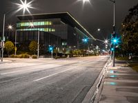 a empty city street at night with lights glowing on the buildings and street curbs