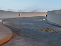 An aerial view of a high position parking deck in Los Angeles, USA. The road curves as it enters the driveway of the elevated parking garage. The top-down shot captures the suburban neighborhood in the early dawn light.
