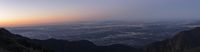 This is an aerial view of Los Angeles, California, USA at dawn. The image showcases the cityscape surrounded by mountains and open spaces. The high mountains provide an elevated overview of the landscape. The clear sky contrasts with the dark horizon and creates a stunning atmosphere. The mountain range in the background adds depth to the scene. This photo captures the beauty of nature and the urbanity of Los Angeles, making it the perfect depiction of the city's skyline at night.