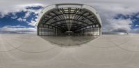 a long walkway of cement leading to an airplane hangar with an airplane boarding door open