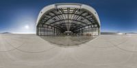 an airplane is flying near a hangar with people around it and a clear blue sky