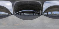 a skateboarder takes a selfie in front of an airport structure in his video camera
