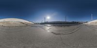 Aerial view of a parking lot in Los Angeles, California. The concrete landscape is lined with cars and surrounded by buildings. The fish-eye lens captures the city's architectural patterns and the open space. A unique perspective of urban design.