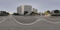 A dawn view of a street intersection in downtown Los Angeles, California. The high-rise buildings create a stunning cityscape against a clear sky. The straight road lined with white painted lines leads to a bustling metropolis.