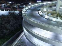 This is an image of the nighttime cityscape of Los Angeles, California, USA. The photo captures the architectural design of the city, with high-rise buildings and a mix of residential and commercial structures. The roads wind through the metropolitan area, illuminated by street lights and artificial light. The clear sky contrasts with the illuminated skyline. The infrastructure of the city can be seen, including steel structures, concrete streets, and parking decks. This image represents the urban design and landscape of Los Angeles at night.