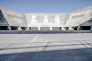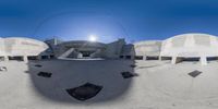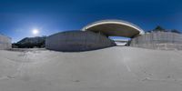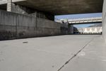A panoramic view of Los Angeles, California. The city's iconic architecture and concrete structures stand tall against a clear sky. The open space showcases the city's urban and industrial vibes. A low-angle shot captures the straight road leading to the underpass.