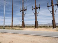 An asphalt road in Los Angeles, California, under a clear sky. Windmills and factories dot the industrial landscape of the Mojave Desert, with mountains in the background, capturing a day marked by construction and manufacturing.