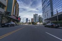 A view of a busy city street in downtown Los Angeles. Cars are driving along the asphalt road, creating a motion blur effect. The cityscape captures the essence of California's urban design and vibrant city life.
