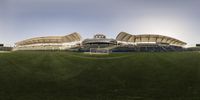 an empty baseball stadium sitting next to the green grass lawn in the day time,