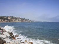 Breathtaking coastal view in Los Angeles, California. The stunning overlook showcases the majestic cliffs and rocky beach. People enjoy a sunny day by the water, surrounded by the beauty of the ocean.