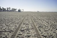 people walk on sand at a beach, near the ocean in the distance is a sky with few cloudless, and blue skies