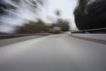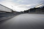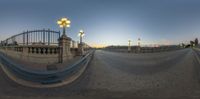 the view of a bridge from a fisheye lens, with lights on a pole, in the evening