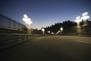 A mesmerizing view of a bridge in Los Angeles, California, captured through a fisheye lens. The illuminated structure stands out against the partly cloudy night sky, creating a stunning silhouette. A perfect scene for a road trip in the USA.