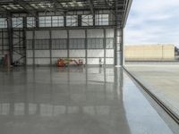 This is a photo of an industrial warehouse located in Los Angeles, California, USA. The interior of the building features a spacious open space with concrete flooring and large windows that let in natural light. The architecture of the warehouse is characterized by its metal roof and glass walls. Outside, there are loading docks and a storage area. The clear blue sky and fluffy clouds can be seen above the warehouse. This image represents the modern and industrial architecture found in Los Angeles.