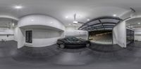 Aerial view of a modern architectural marvel in Los Angeles, California. The high-rise building features a sleek facade with floor-to-ceiling windows. The interior showcases a spacious parking garage with a small car. A perfect blend of urban design and luxury living.