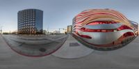 A futuristic, fish-eye view of Los Angeles' business district. Modern architecture and clear skies create a stunning cityscape. The spherical sculpture mirrors the straight road, enhancing the urban vibe.