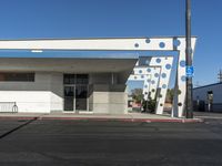 A clear day in Los Angeles, California showcasing a mix of modern and classic architecture. Residential homes, office buildings, and gas stations line the suburban streets. The iconic skyline is framed by palm trees and clear blue skies.