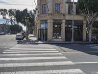 A sunny day in Los Angeles, California. Classic architecture blends with urban design. Busy streets lined with shops and storefronts. Cars driving on asphalt roads. Serene tree-lined crosswalks add to the charm of the city.