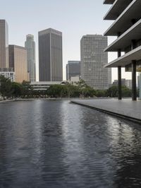 A stunning view of the city of Los Angeles, located in California, USA. The image captures the beautiful architectural structures, including apartments, buildings, and houses, in a mixed-use residential area. It showcases the urban atmosphere of the metropolitan area, with high-rise condominiums and corporate headquarters visible. The clear sky and calm water surface create a reflection, adding to the overall beauty of the cityscape. This stock photo perfectly represents the vibrant and coastal aspect of Los Angeles.