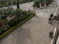 A long courtyard in Los Angeles, California, surrounded by beautiful flowers and lush greenery. This residential area is a perfect blend of nature and classic architecture, offering a serene space for recreation and relaxation under the Californian sunshine.