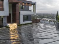Early morning in Los Angeles, California. Modern architecture blends with traditional cobblestone streets and open spaces. Water glistens on the concrete surfaces of residential buildings. The grey sky adds a moody atmosphere.