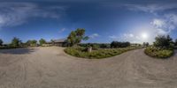 Three residential houses in Los Angeles, California, surrounded by a large grassy field. A dirt road leads to the houses, creating a rural and peaceful atmosphere. The clear sky and lush vegetation add to the beauty of the landscape.