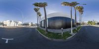 A sunny day in Los Angeles, California. A modern white building with a brick facade stands amidst palm trees. The street is lined with parked cars and features a chain link fence. A vibrant city scene in the heart of LA.