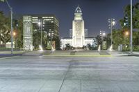 A stunning view of downtown Los Angeles at night. The city's iconic skyscrapers and high-rise buildings create a captivating cityscape against a clear night sky. Street lights and artificial light illuminate the city, showcasing its classic architecture. A true metropolitan masterpiece.