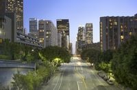 This image captures the vibrant cityscape of Los Angeles, California, USA. Taken at dawn, the city lights illuminate the metropolitan area. The high-rise buildings and skyscrapers create an impressive urban skyline. The straight road, made of asphalt, leads straight through the city. The artificial lights create a beautiful contrast with the dark sky. Los Angeles is known for its high energy and bustling city life. This photo perfectly represents the dynamic and elevated atmosphere of this metropolis.