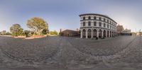 A 360-degree view of a plaza in Los Angeles, California. The fish-eye lens captures the classic architecture of the surrounding buildings. The open space is filled with shops, restaurants, and businesses. A vibrant urban scene under a clear sky.