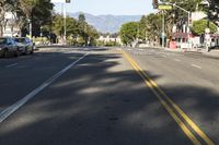 an empty street with cars parked along the side of it and a mountain in the background