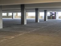 parking spaces with multiple level ramps and concrete columns, with signs on the floor in front of them