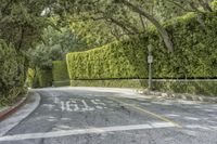 This image captures a beautiful suburban scene in Beverly Hills, California. The photo was taken from a low angle, looking straight down the road. The road surface is smooth asphalt, lined with green vegetation, shrubs, and trees. The residential neighborhood is surrounded by hills, adding to the picturesque view. This photo represents a typical sunny day in Beverly Hills, with clear blue skies and lush greenery. The peaceful and serene atmosphere of this suburban public space is perfect for relaxation and leisurely walks.