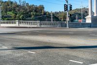 A clear day in Los Angeles, California. A suburban road with asphalt surface and a bridge in the background. Trees line the road and a fence borders the public space.