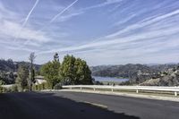 This image captures a beautiful view of a highway in California, USA, leading towards the ocean. The road is smooth asphalt and is surrounded by residential areas and lush green trees on the hills. The infrastructure includes guard rails and street lights along the thoroughfare. The clear blue skies with scattered clouds enhance the stunning overlook. In the distance, you can see the famous neighborhoods of Beverly Hills and Bel Air. This photo depicts a sunny day in California, showcasing the scenic beauty and the well-maintained road network.