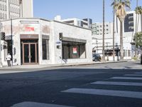 This image showcases the classic architecture of the art district in Los Angeles, California. The vibrant city atmosphere is captured with clear skies and bustling urban streets. The road is lined with storefronts and shops, adding to the city's charm. The sunny day illuminates the beautiful architecture and asphalt roads. This photo represents the dynamic and artistic vibe of Los Angeles.