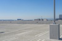 This image showcases the urban landscape of Los Angeles, California, USA. The city is known for its iconic architecture and open spaces. In the foreground, we see a parking deck with its concrete surface and lines. The building's rooftop provides an overlook of the city's skyline, stretching towards the horizon. The clear sky above enhances the view of the urban design and city life. This photo captures the essence of Los Angeles, with its modern architecture and bustling urban atmosphere.