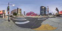 A futuristic intersection in Los Angeles, California. The city's metropolitan area comes alive at dawn, showcasing its unique architecture. A massive red object stands near the stoplight, adding a pop of color to the urban landscape.