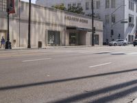 This is an image of a classic architecture building in Los Angeles, California. The building is situated by an asphalt road with trees lining the street. The city is alive during the day, with cars driving on the road and people walking on the sidewalk. The building has beautiful windows and a storefront, adding to the urban design and charm. In the background, a flag can be seen waving, symbolizing the pride of being in the USA. This photo captures the essence of Los Angeles, showcasing its architectural beauty and vibrant urban atmosphere.