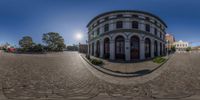 A fisheye view of the classic architecture in downtown Los Angeles. The circular picture captures the bustling city life, with buildings, trees, and open spaces. Clear sky highlights the elegant facades and brickwork. A unique perspective of urban design in California.