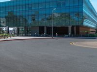 A modern office building in the heart of Los Angeles, California. The clear sky highlights the architectural beauty of the city. Two people walking along the road add to the vibrant urban scene.